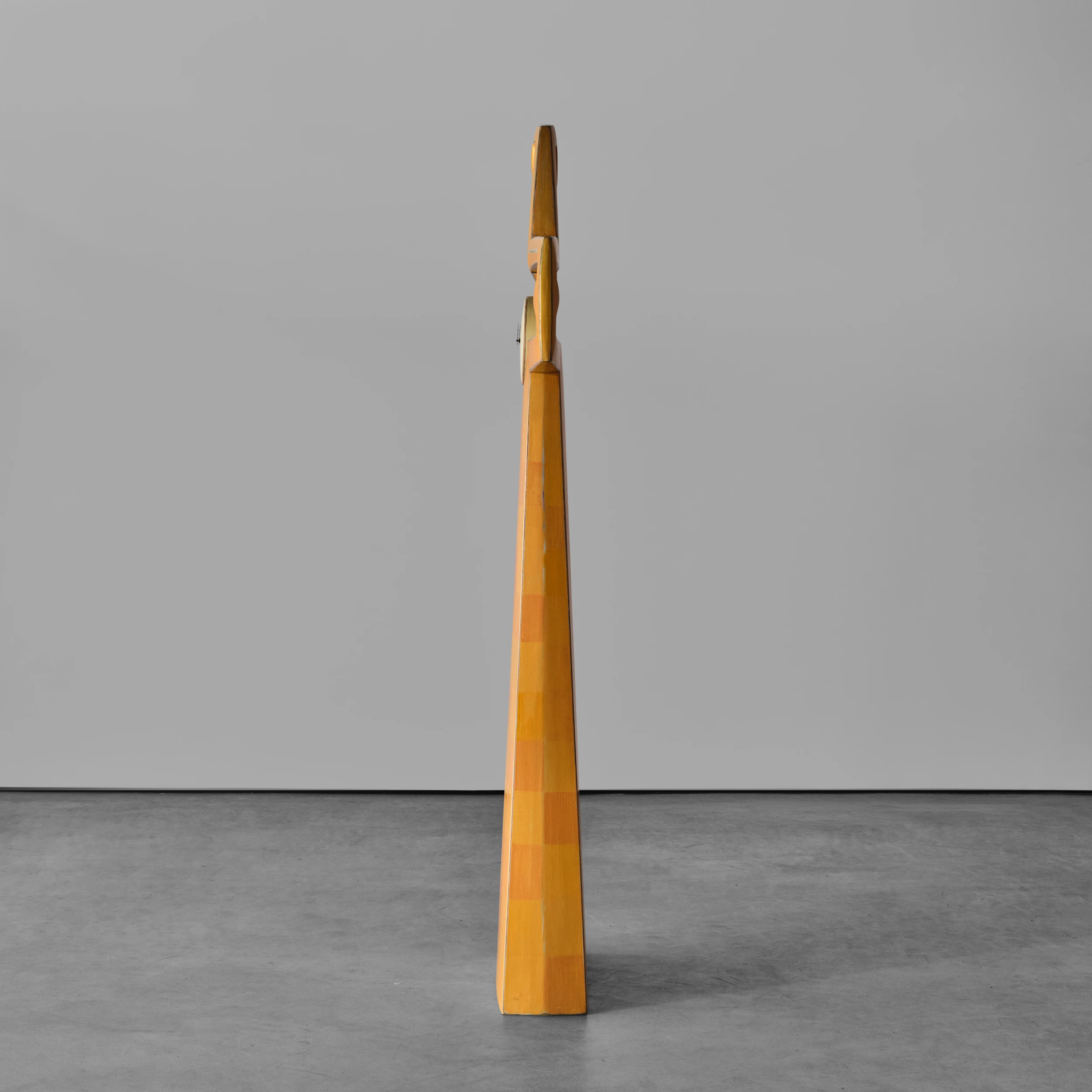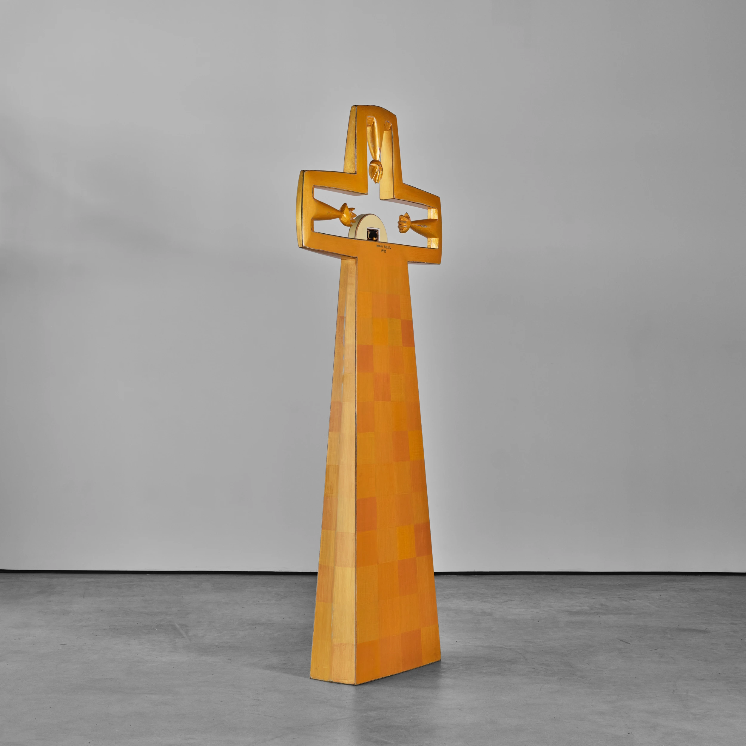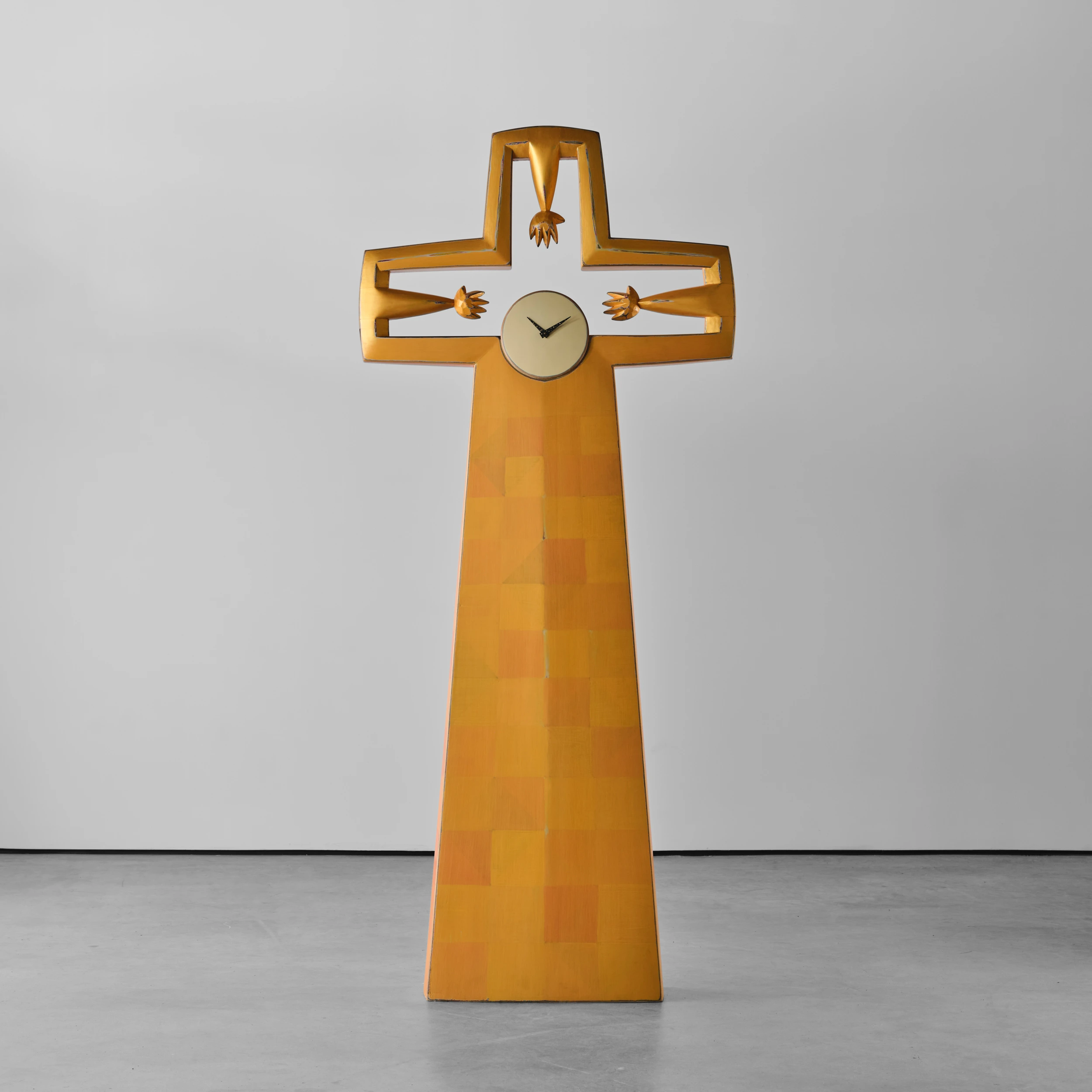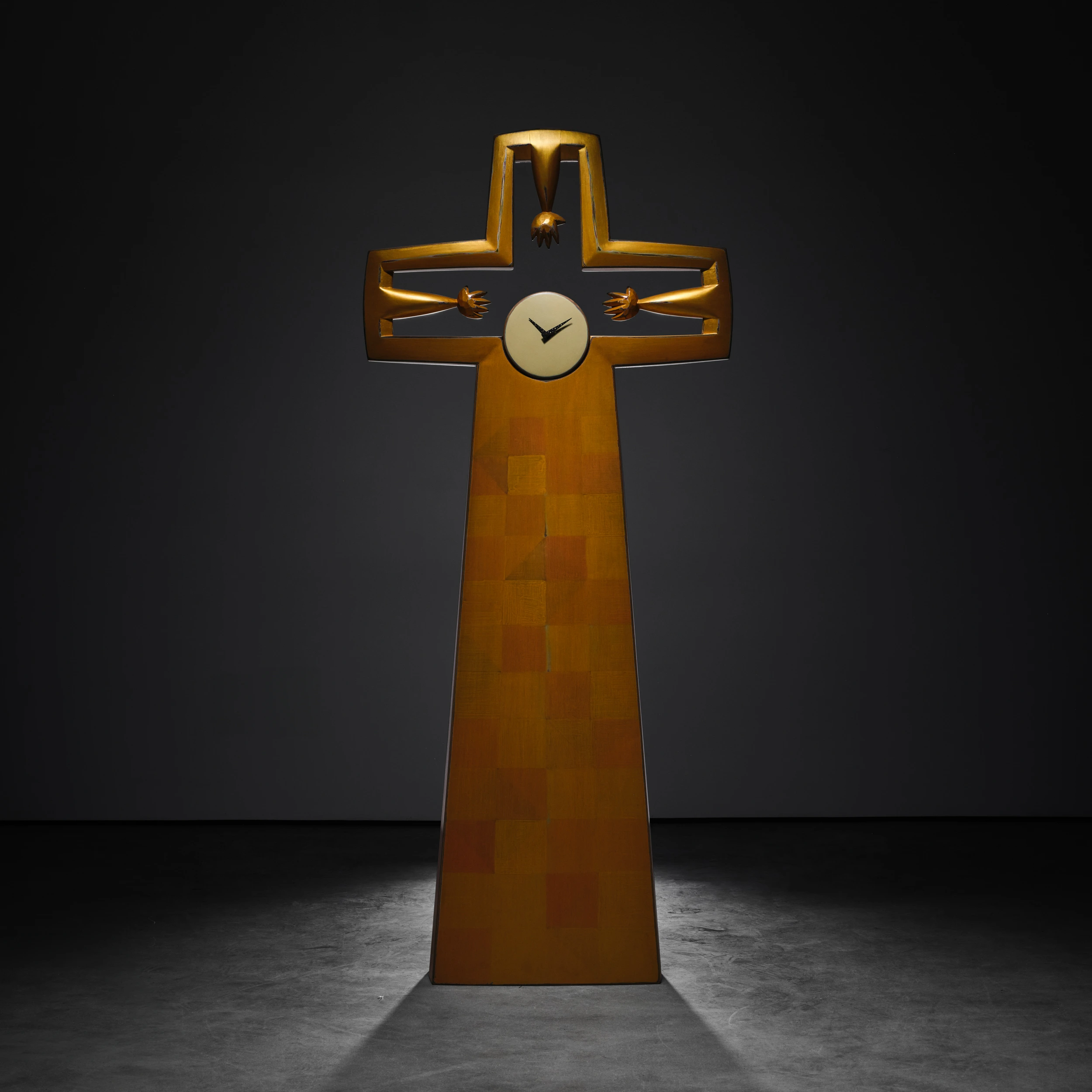 Randy Shull’s “Clock” is a large, cross-like form which features accumulated layers of milk paint which are subsequently etched along the edges and outlines of the work to reveal the colorful stratification. These revealed edges and outlines engender a sketch-like quality in the work. At the focal point of the piece is a functional clock which three outstretched hands appear to grasp for.