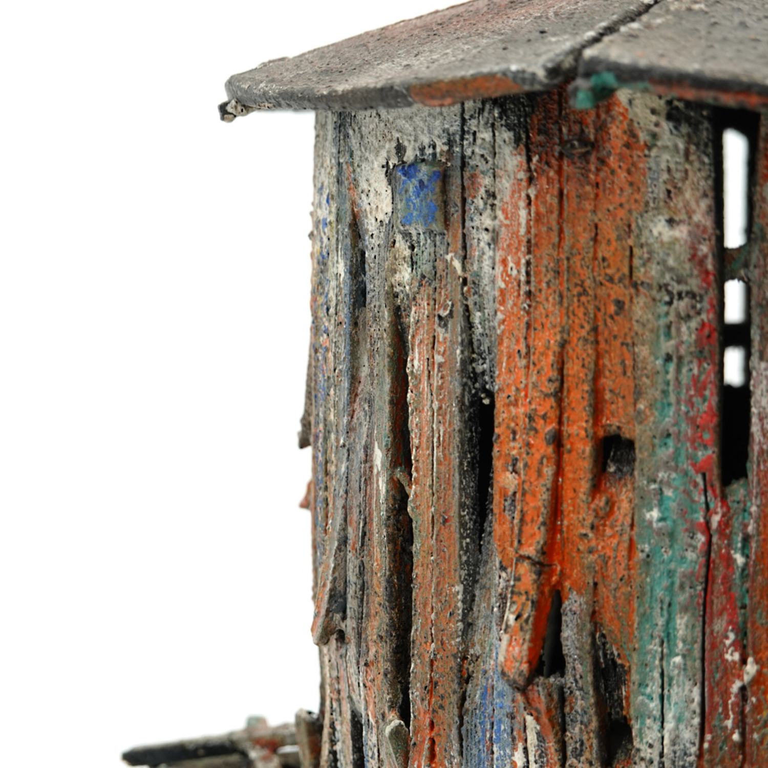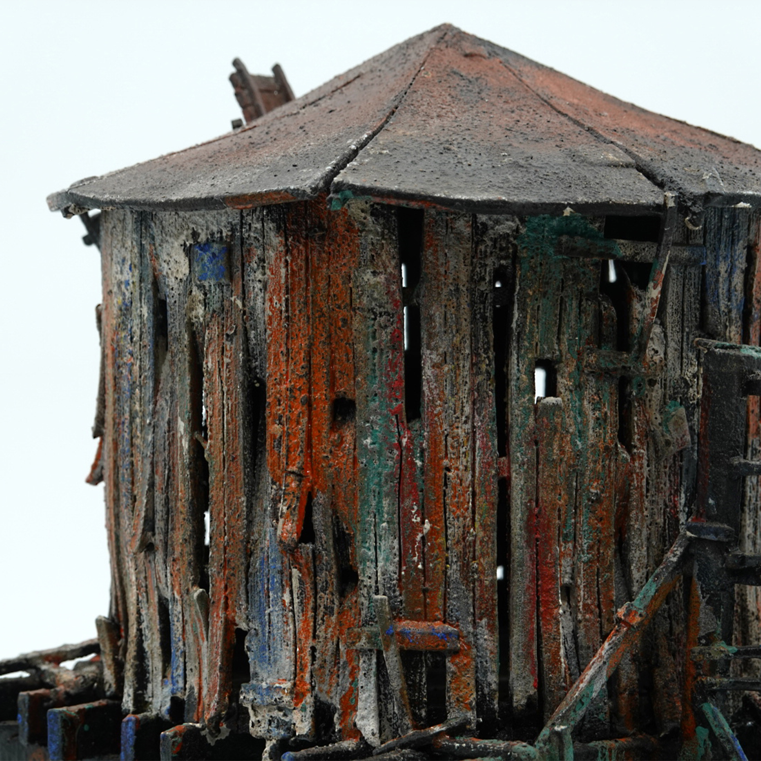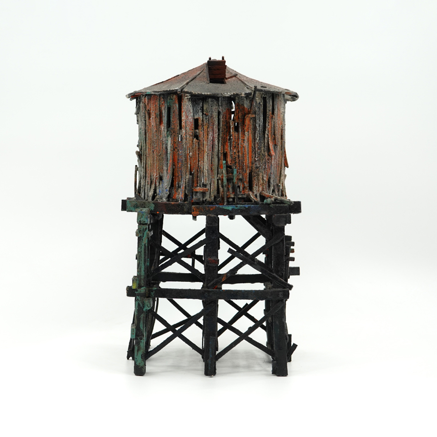 Meticulously crafted from astonishingly thin ceramic strips that have been precisely cut, textured, painted and assembled, Elozua’s Water Tanks, such as Water Tank Series II-#10 (1979), represent his dual interests in containment and industrial structures and reflect the urban landscape surrounding his Elizabeth Street studio in lower Manhattan. His fascination with form and surface in these free-standing, weather-beaten water tanks foreshadows the artist’s elaborate, industrial landscapes. Simultaneously, employing colors such as barn red, rust, grey, and slate blue, Elozua establishes his signature palette of decay, which he uses throughout his career.