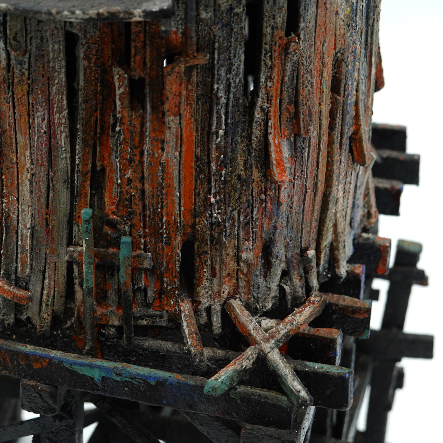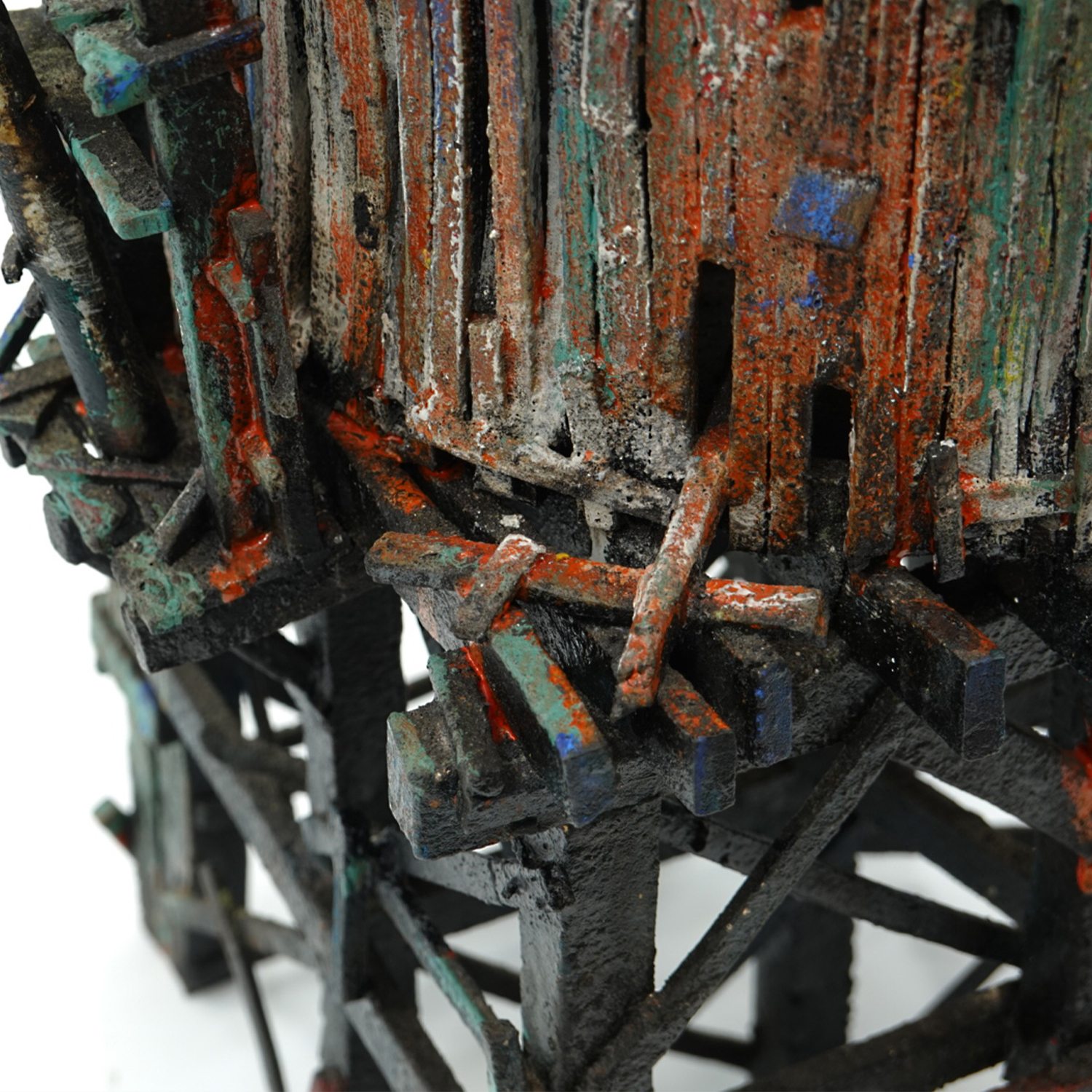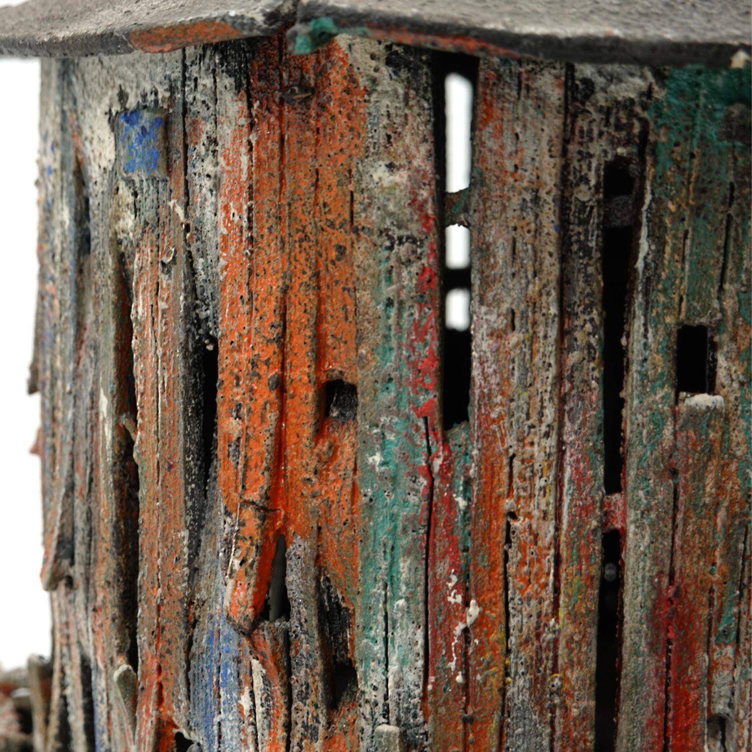Meticulously crafted from astonishingly thin ceramic strips that have been precisely cut, textured, painted and assembled, Elozua’s Water Tanks, such as Water Tank Series II-#10 (1979), represent his dual interests in containment and industrial structures and reflect the urban landscape surrounding his Elizabeth Street studio in lower Manhattan. His fascination with form and surface in these free-standing, weather-beaten water tanks foreshadows the artist’s elaborate, industrial landscapes. Simultaneously, employing colors such as barn red, rust, grey, and slate blue, Elozua establishes his signature palette of decay, which he uses throughout his career.
