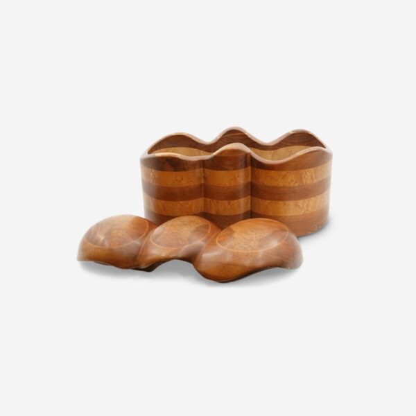 “I made this “Cloud Box” when I was teaching at the Worcester Craft Center in 1977. It’s one of maybe 5 pieces made out of walnut and bird’s-eye maple that year, and I think was probably sold at a craft fair, maybe Rhinebeck? In 1978 or so? Can’t remember exactly – although I seem to remember having sold it to someone named Doug… But that was a long time ago. I still have one from that series that I kept all these years and would not sell. This series is something I began in the mid-seventies and was a phase I went through. The majority of the Cloud Boxes were made of spalted maple cut from one piece and reassembled so the walnut stacked laminated pieces are atypical of the series and were mostly experimental as I was working out construction techniques. This is definitely an original Mark Lindquist piece, yet is not something immediately recognizable of my work other than the Cloud Box form itself. I discuss the series in my book ???Sculpting Wood??? published by David in 1986.” MARK LINDQUIST (personal communication)