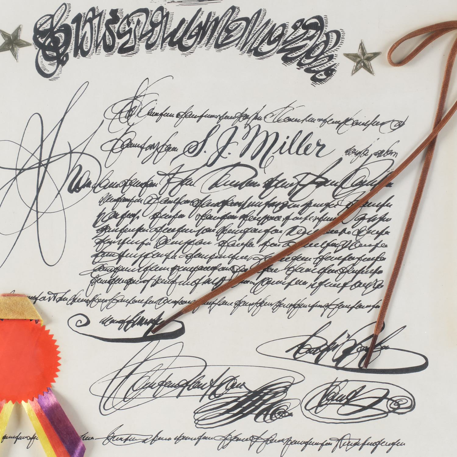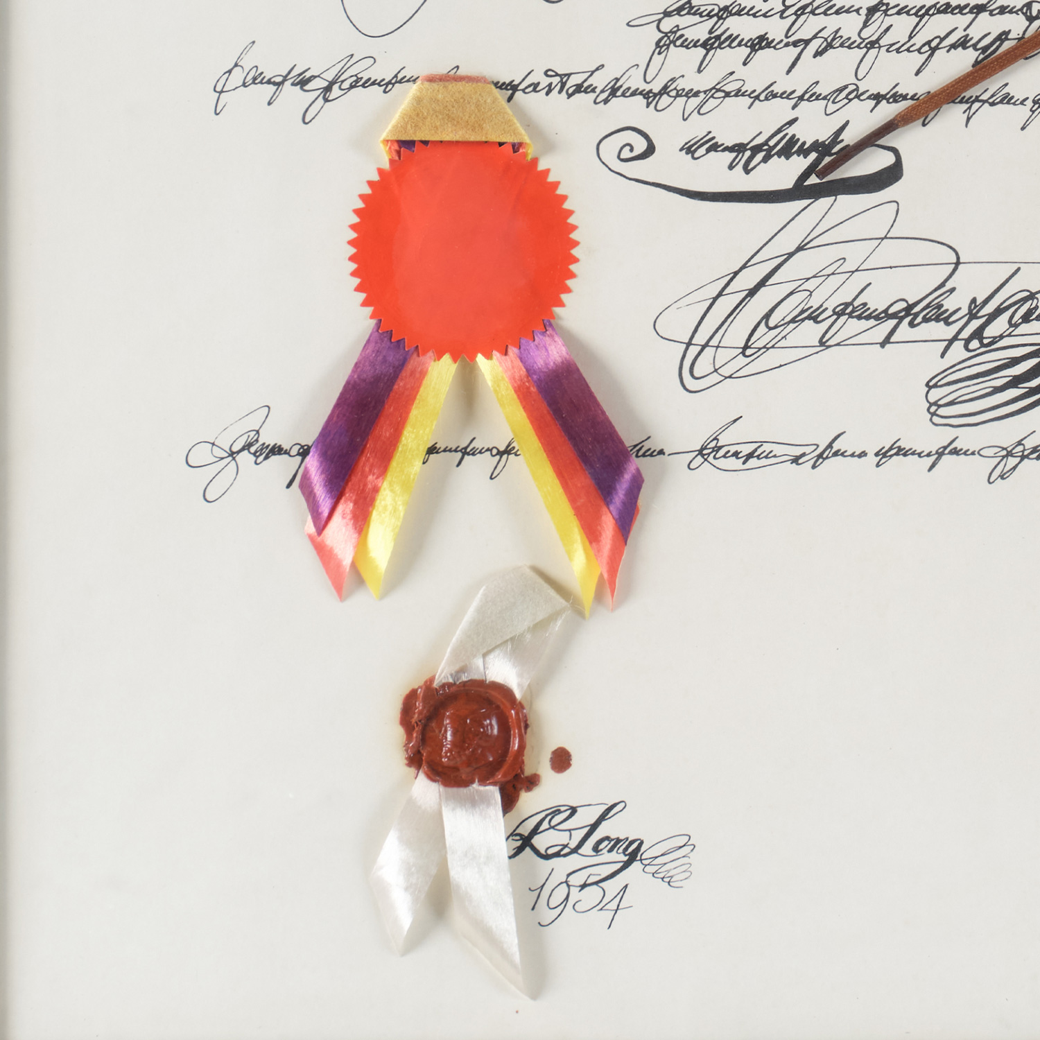 Materials: ink, paper, leather, plastic, ribbon, wax